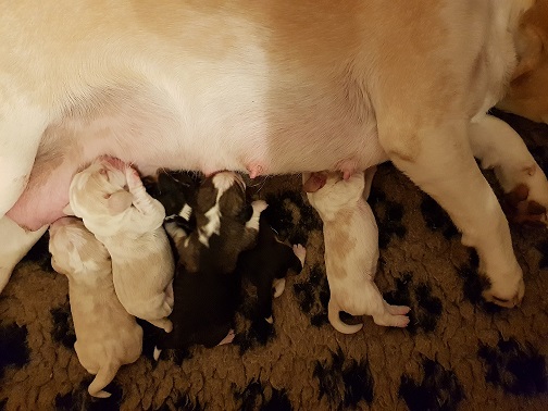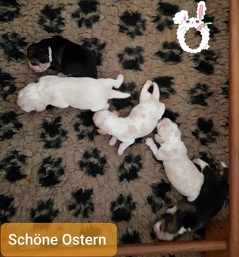 Unsere E2 Sternchen von Hasapiko Tergyan und Bella Blanka von der Halben Welt sind am 04.04.2023 angekommen. Es sind 2 Rüden Tricolour, 2 Rüden bicolour und 1 Hündin bicolour. Der Mama und den Welpen geht es prächtig.