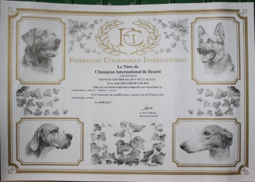 Nachdem er schon Deutscher Champion VDH und Schweizer Schönheits-Champion ist, darf Tiger (Twister von der Halben Welt) sich jetzt auch Internationaler Schönheit`s Champion nennen. Er hat es seiner Oma, seinem Opa und seinen beiden Uropa`s nachgemacht. Wir sind stolz auf und ihn und seine Besitzerin Elke ohne die er das nie geschafft hätte.